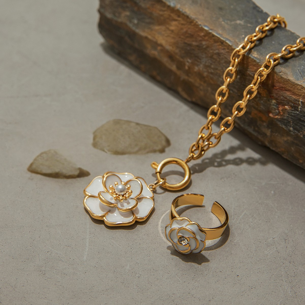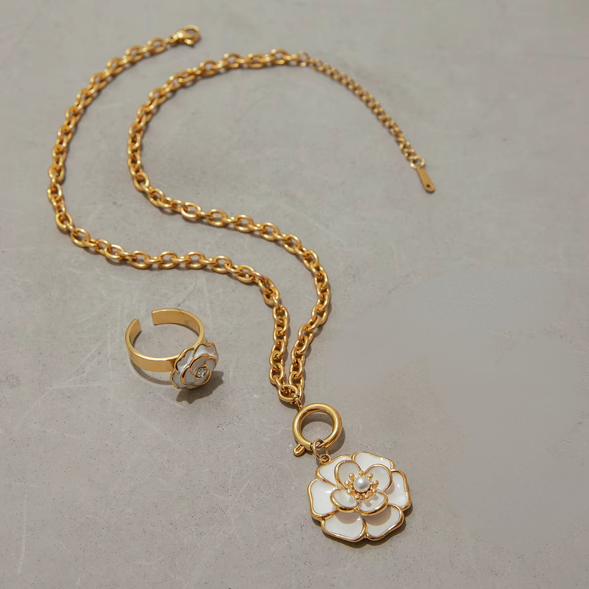 Alba di Neve Set is an elegant jewelry duo created to express purity, softness, and refined feminine beauty. This graceful pairing brings together the delicate charm of Anello Alba Bianca Ring and the radiant floral elegance of Fiore di Neve Necklace, forming a harmonious set that feels polished, romantic, and effortlessly luxurious.