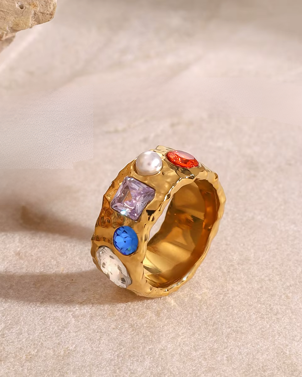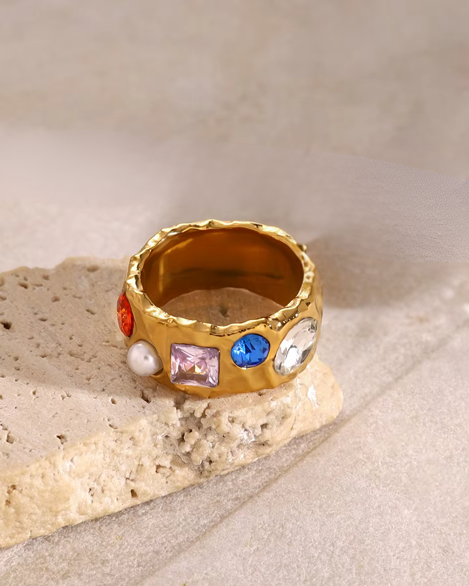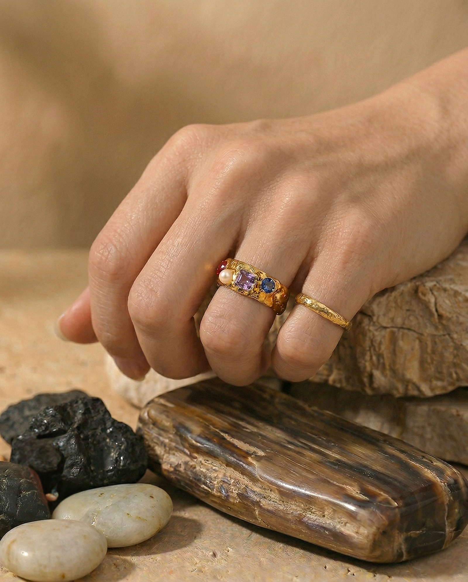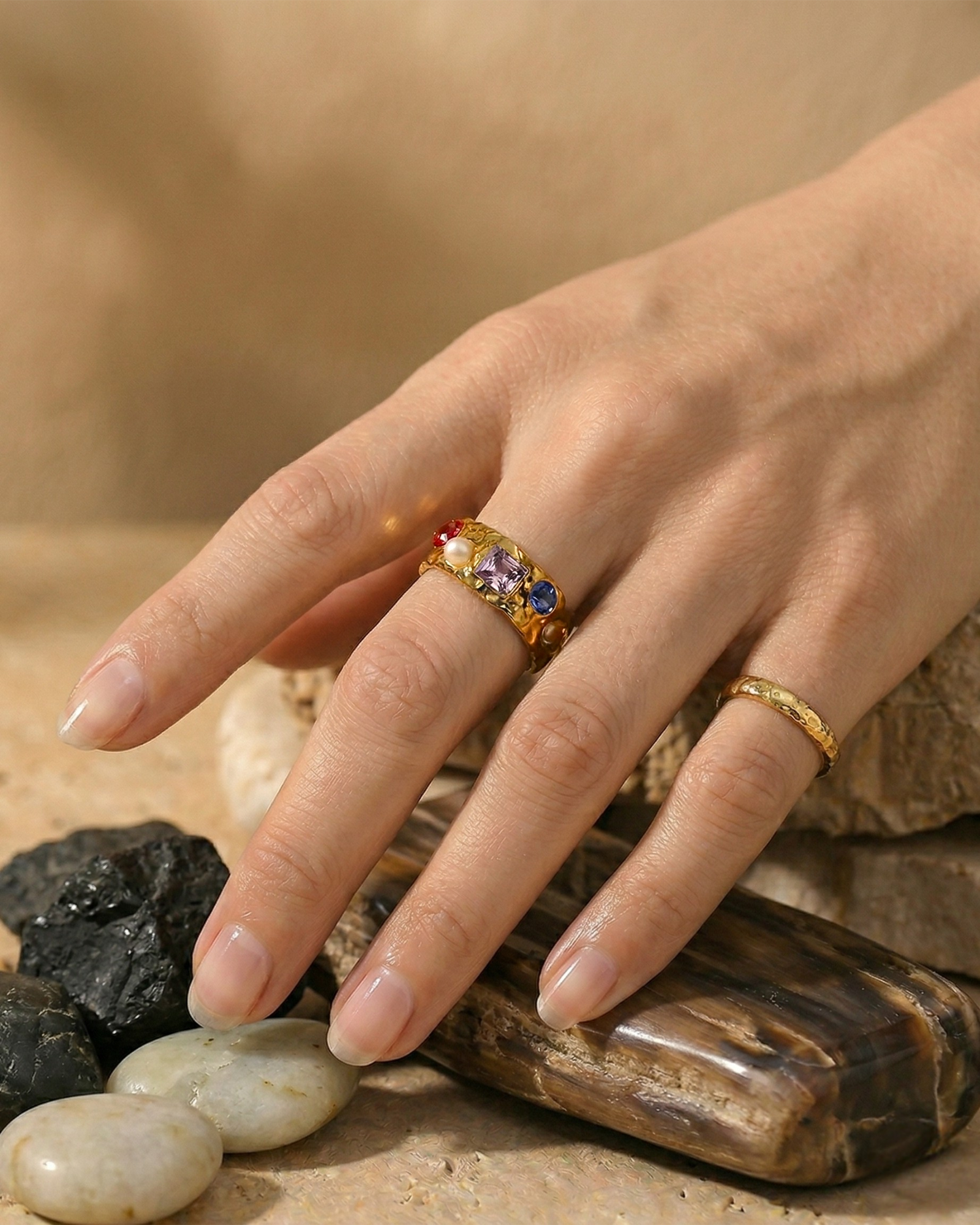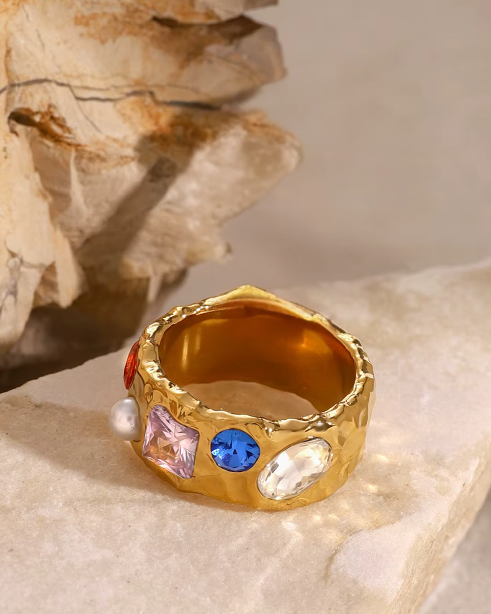 Aurora Ring is a radiant, expressive statement piece designed for women who love bold artistry and vibrant color. The ring features a rounded golden silhouette with a beautifully irregular, organic surface — a sculptural texture that gives the piece depth, movement, and a captivating glow.