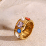 Set across the dome are multicolored crystals, each carefully placed to create a lively, shimmering mosaic that catches the light from every direction. The scattered crystal arrangement gives the ring an energetic, cosmic feel, making Aurora Ring a true centerpiece that elevates any outfit instantly.