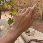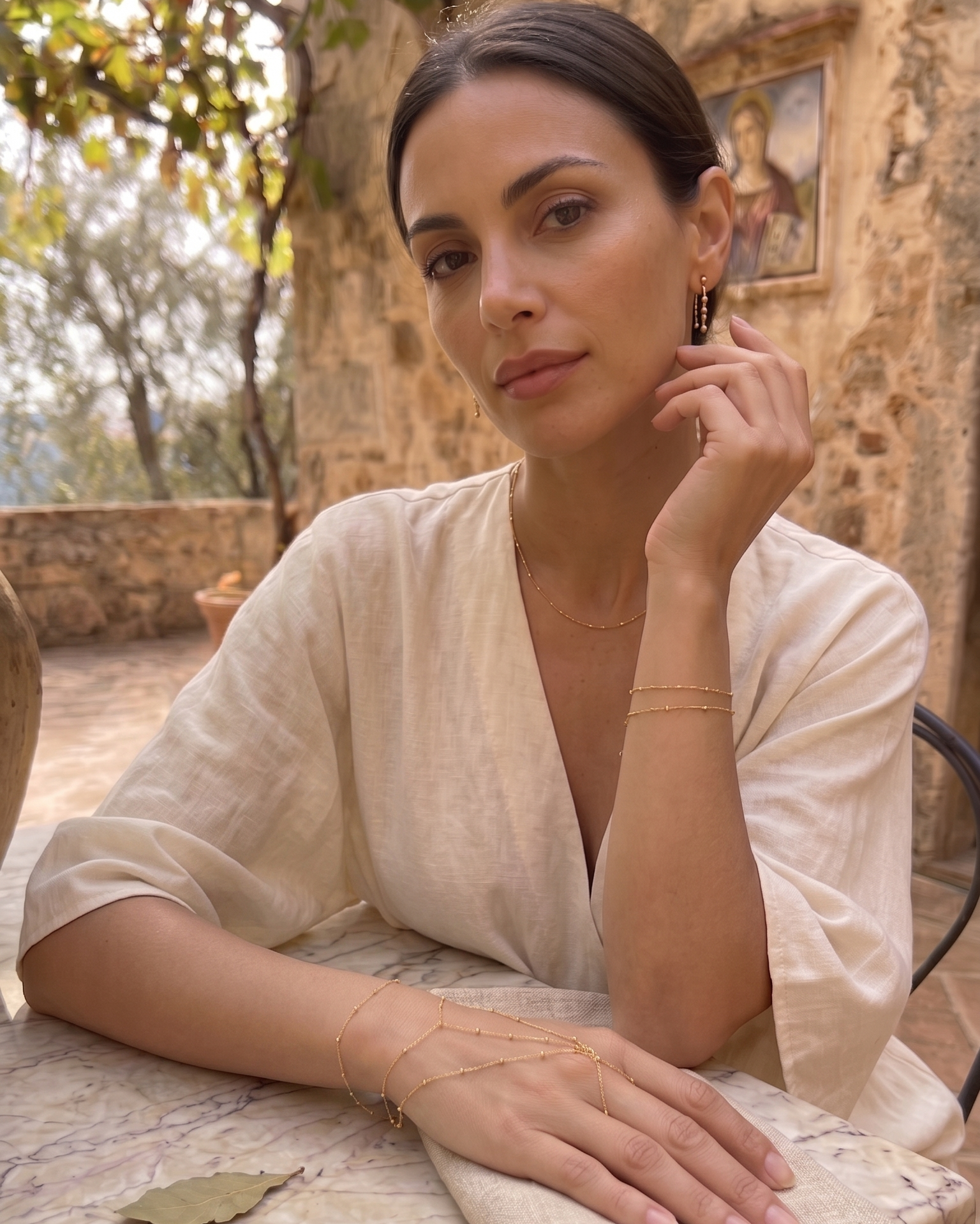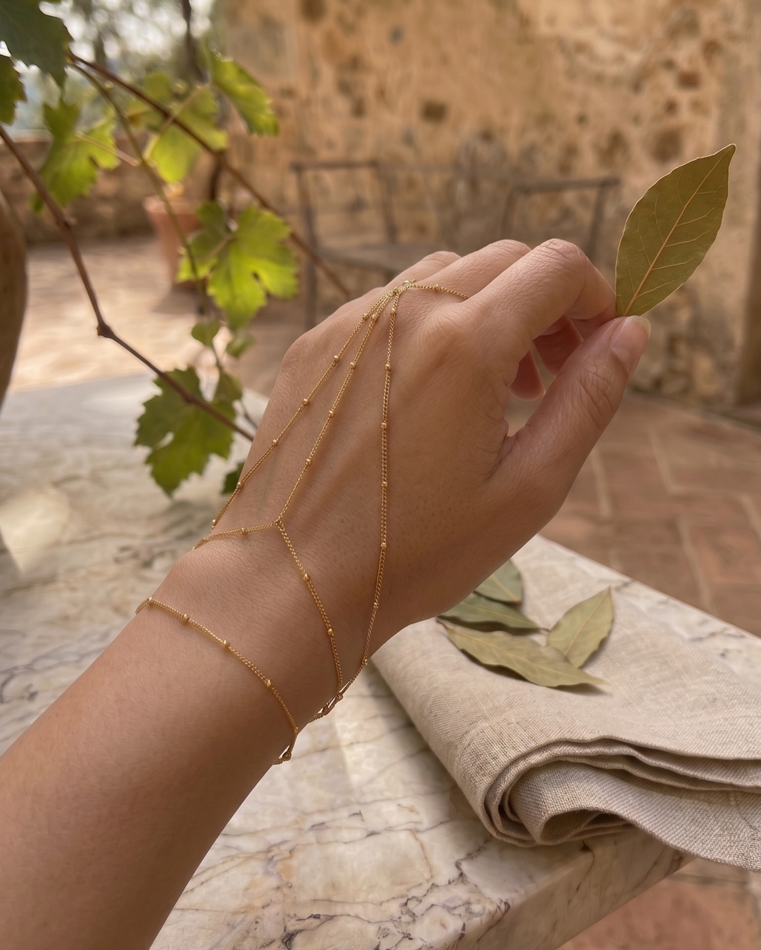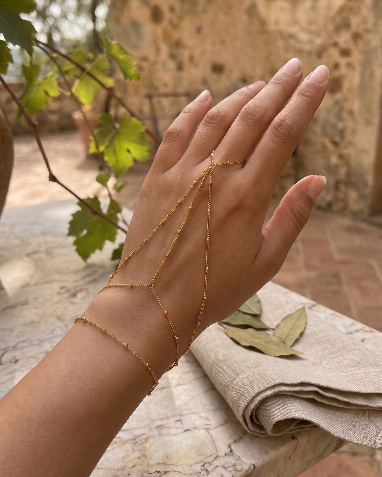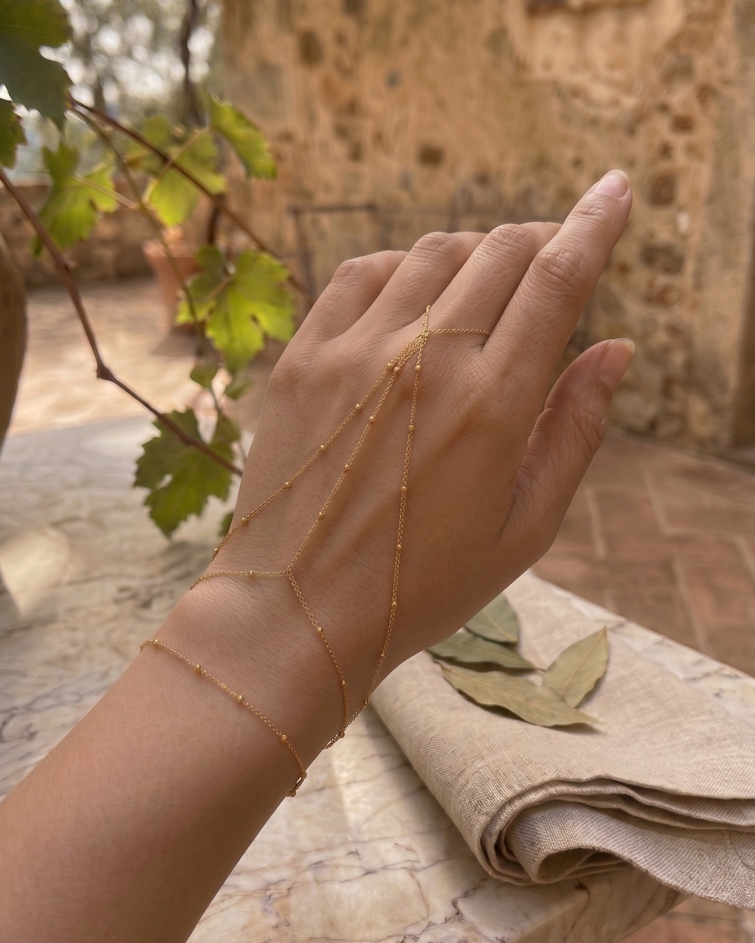 Catena di Grazia Hand Chain is a delicate, feminine masterpiece designed for women who adore refined gold details that flow gracefully across the hand. This elegant piece features a double-layer bracelet connected to three fine cascading chains, all leading to a slim finger loop that completes the design with poetic harmony.