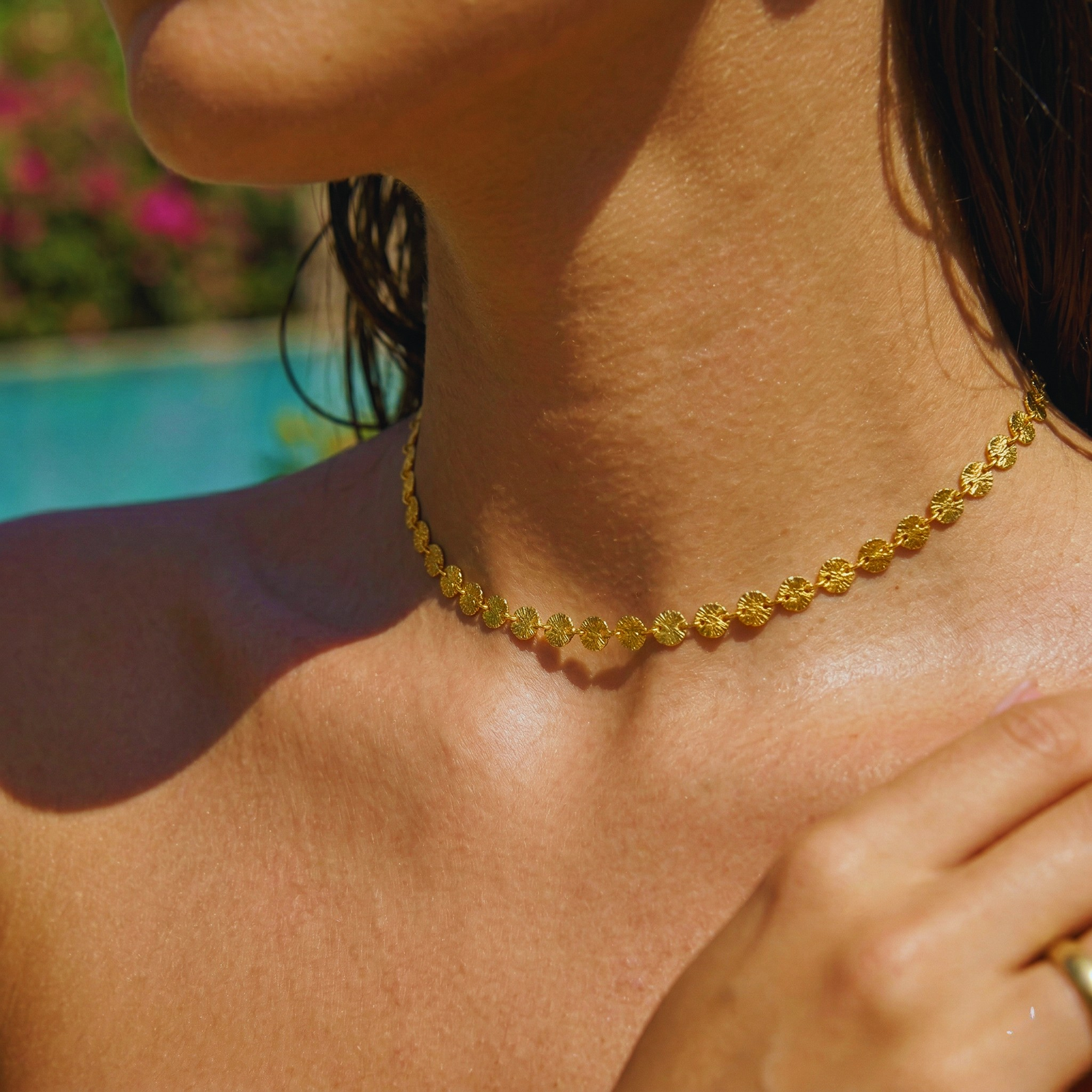 Conchiglia Pura is a gold-plated necklace inspired by the calm purity and natural elegance of seashells. Its smooth, refined design reflects the soft curves and serene beauty of the ocean, making it a timeless essential that brings subtle sophistication to any look. With a length of 38 cm plus a 5 cm extender, it offers adjustable styling for a perfect neckline fit—whether worn as a short, clean statement or slightly longer for a relaxed, effortless finish.