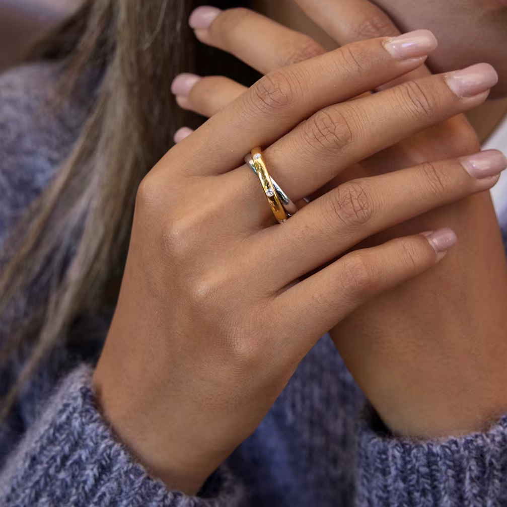Doppia Scintilla Ring is a refined, dual-tone design crafted from two slim interconnected bands — one in polished gold tone and the other in sleek silver tone — creating a minimal yet striking contrast. The two bands are joined together to form a single elegant ring that feels modern, feminine, and effortlessly stylish.