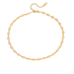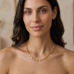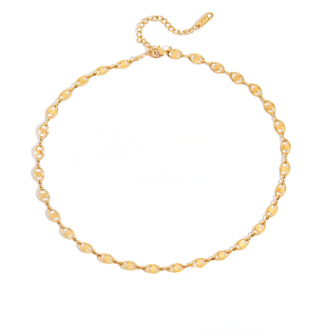 Evil Eye Charm Necklace is a delicate basic piece designed for women who appreciate symbolic jewelry with a modern golden elegance. The necklace features a chain of interconnected eye-shaped charms, forming a graceful sequence that rests beautifully along the neckline.