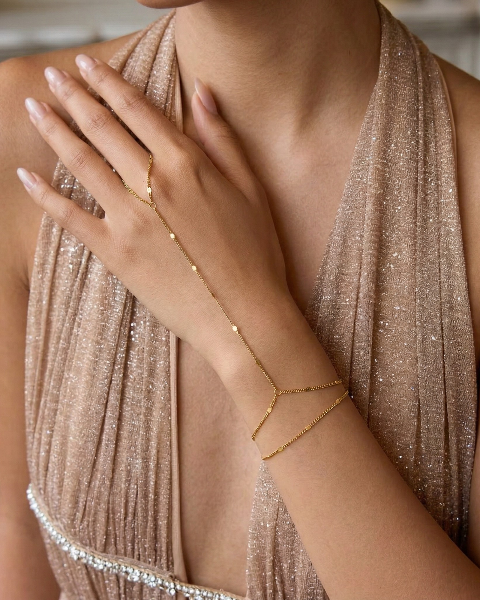 Every part of the piece — the bracelet, the descending chain, and the finger loop — is crafted from thin, polished chains adorned with ultra-small square accents, adding a subtle geometric sparkle that catches the light with every movement. The effect is minimal yet captivating, creating a graceful line of gold that flows naturally along the hand.