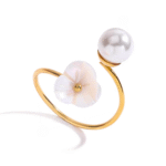 This open-ended ring features two gracefully balanced elements: a luminous pearl-inspired bead on one side, and a beautifully sculpted white floral motif on the other. The pairing of pearl and flower creates a harmonious blend of purity, softness, and refined allure.