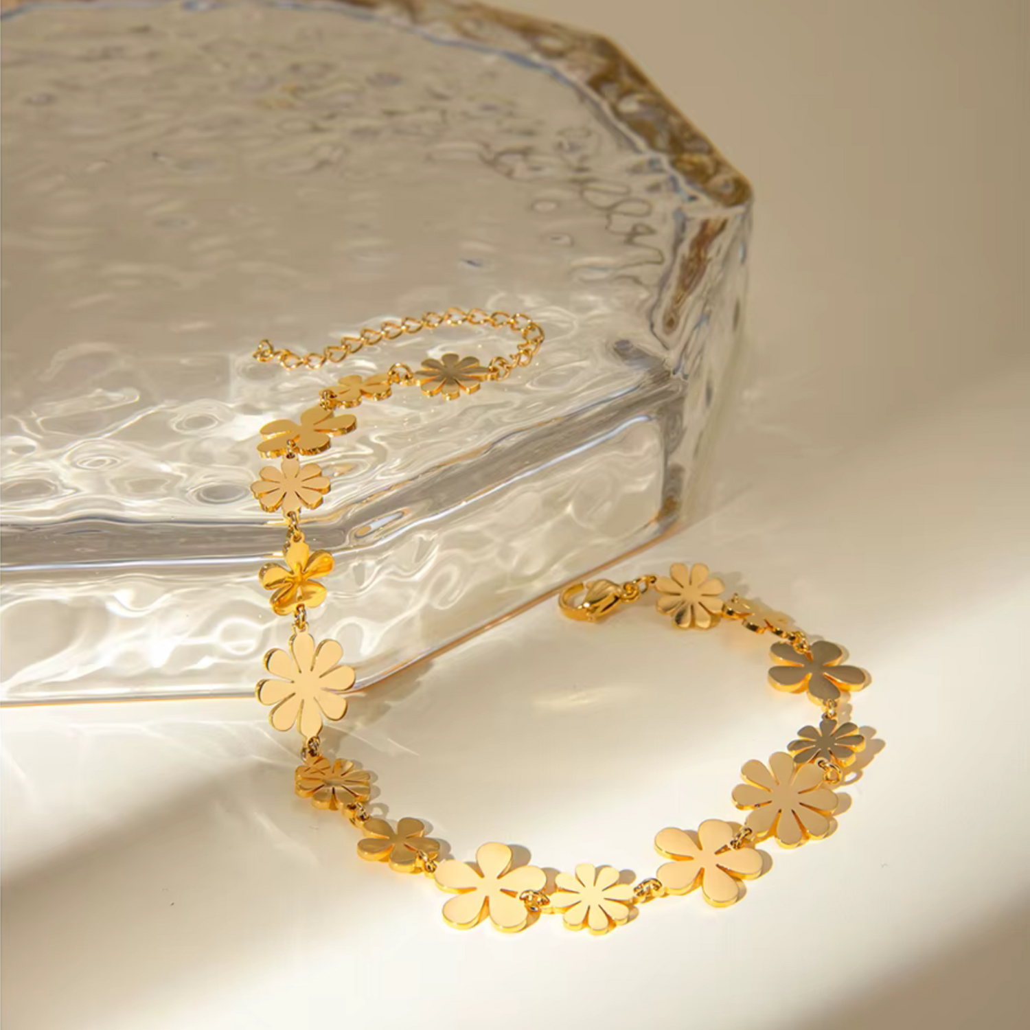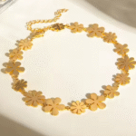 Petali d’Oro Anklet is a radiant, feminine piece designed for women who adore floral elegance with a luxurious golden glow. The anklet features a seamless chain of interlinked five-petal flowers, each sculpted with soft curves and polished surfaces that capture the warmth of the light beautifully.