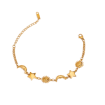 Piccola Celestia Bracelet is a delicate celestial-inspired piece crafted for women who love soft elegance with symbolic meaning. Designed with smaller sun, moon, and star motifs, each element is beautifully sculpted and interconnected to form a graceful golden chain that wraps the wrist with subtle cosmic charm.