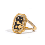 Crafted with a polished gold band topped by a glossy black centerpiece, the ring reflects the quiet elegance of the night sky. The smooth, dark surface creates a striking contrast against the golden frame, giving the piece a modern, artistic glow that feels both powerful and refined.