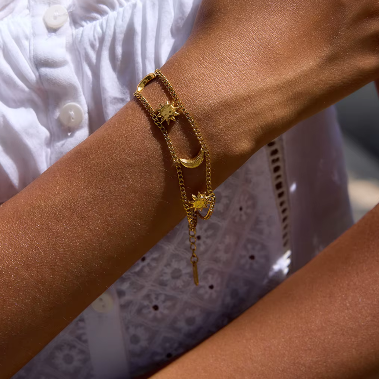Light, symbolic, and beautifully balanced — this bracelet captures the poetry of the sun and moon in a modern golden form.